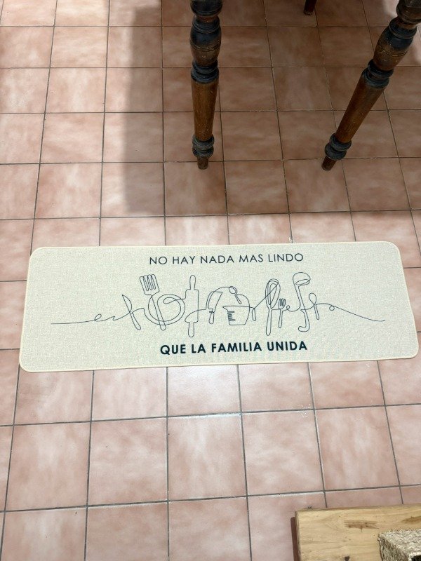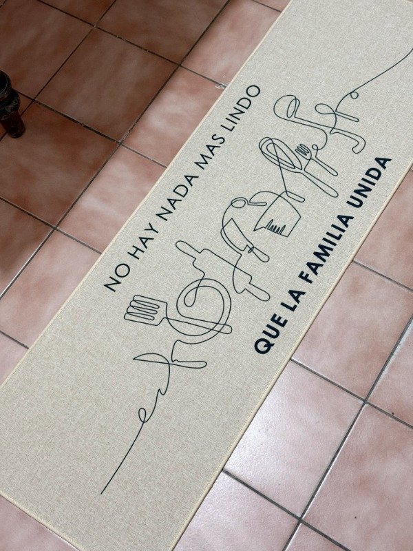 Alfombra de cocina color beige, 100% poliester. Es antideslizante y se puede lavar a mano.