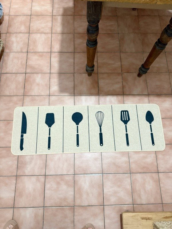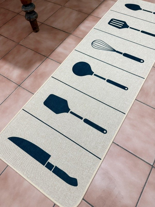 Alfombra de cocina color beige, 100% poliester. Es antideslizante y se puede lavar a mano.